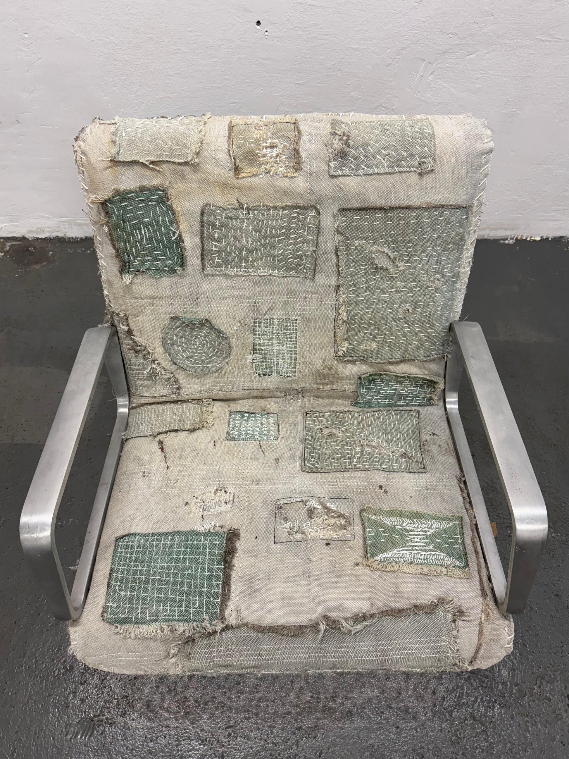 Nowa powłoka powstała ze starej wojskowej plandeki bawełnianej, ręcznie zszywanej i rekonstruowanej w duchu boro, sashiko i patchwork – japońskiej techniki naprawy i poszanowania materiału. Każdy ścieg, przetarcie i łata opowiadają historię odnowienia, nadając meblowi nowy kontekst i unikalny charakter.