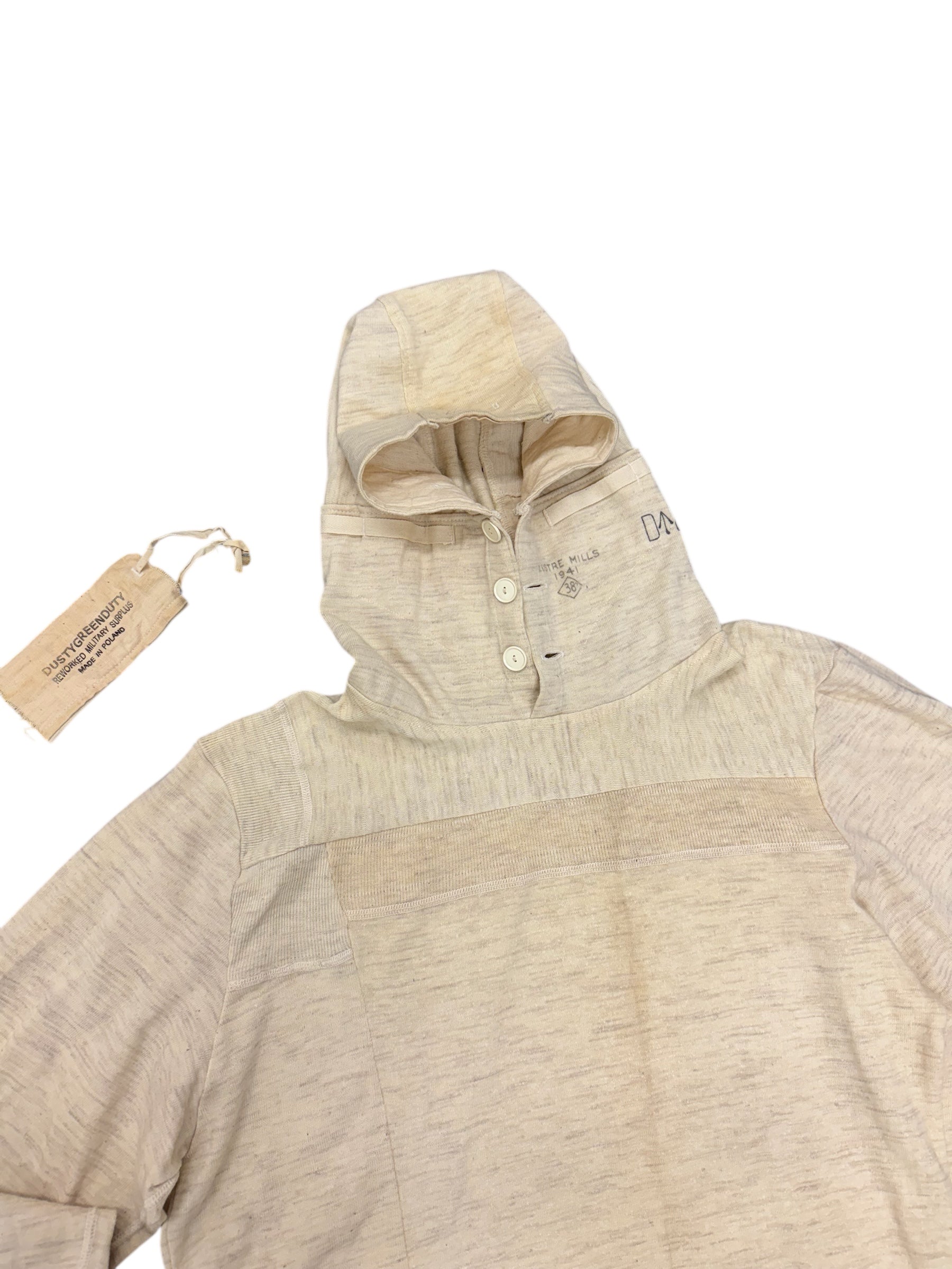 Longsleeve wykonany w całości z deadstockowych, oryginalnych wojskowych kalesonów Armii Brytyjskiej z okresu II wojny światowej 1940 roku.