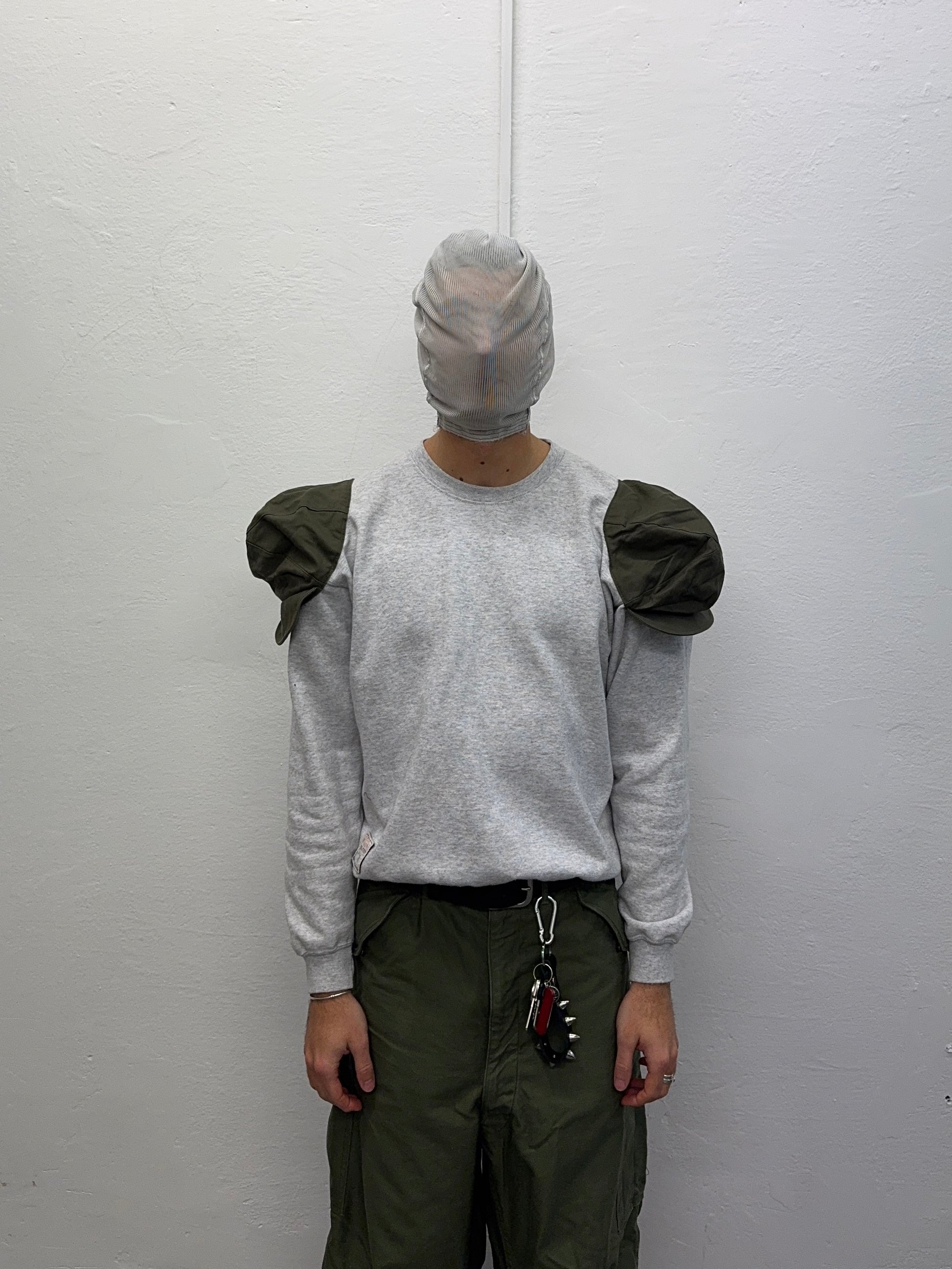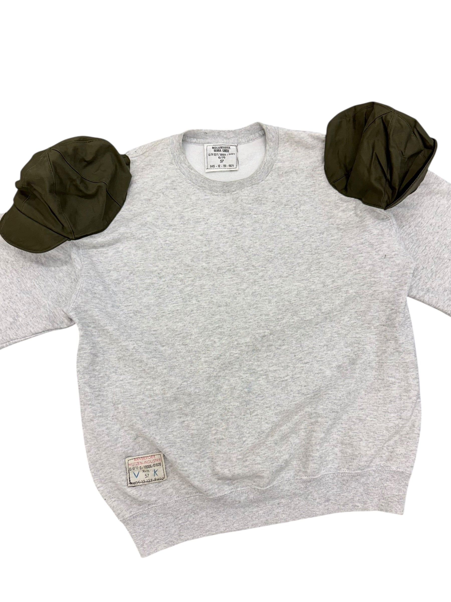 - Vintage cotton sweatshirt with German Army Winter caps sewn directly into the shoulders